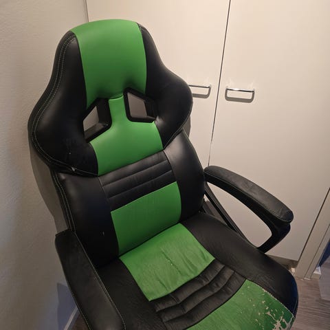 Hyvässä kunnossa oleva pelituoli, noutona. Mukana kuvassa näkyvät tyynyt