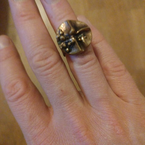 Muutaman kerran käytössä ollut hopeinen iso ja näyttävä sormus. Valmistaja Jorma Laine. Nouto Iitistä tai postitus.