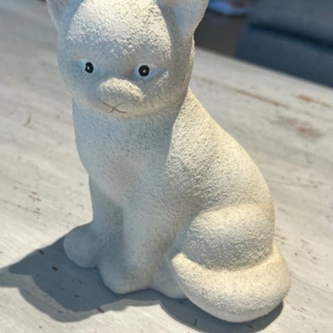 Koristefiguuri, jossa on nainen ja koira. Väri valkoinen. Materiaali ilmeisesti kipsiä. Korkeus n. 19cm