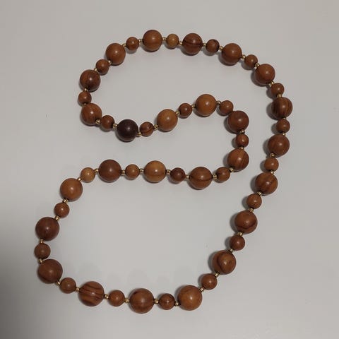 Kotimaisesta nettikaupasta tilattu laserleikattu puukoru / vanerikoru / kaulakoru. Pitkä ketju (ulottuu rintojen alle).
