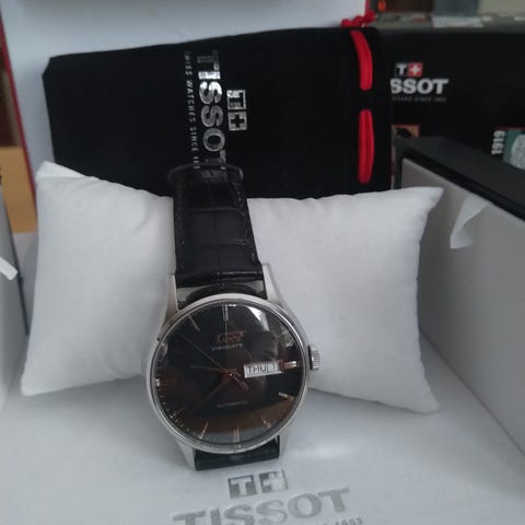 Tissot Heritage Visodate Automatic miesten rannekello, jossa sininen kellotaulu ja metallinen ranneke. Kellossa on automaattinen koneisto, näkyvä takakansi ja se toimitetaan alkuperäisessä Tissot-lahjapakkauksessa.