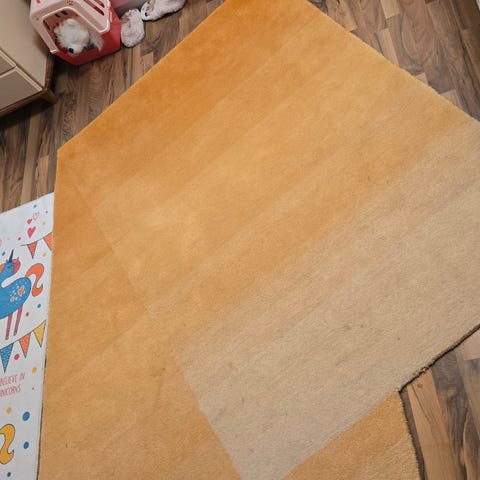 Keltainen virkattu trikookudematto. Hyvässä kunnossa. Juuri pesty.