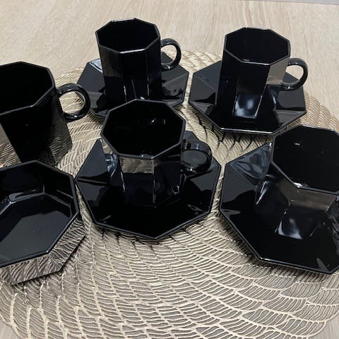 6 lautasta, kuppia ja kermakko. Todella näyttävä sarja vitriiniin tai juhlakäyttöön