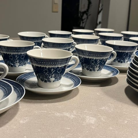 Arabian Iris-sarjan kahvikuppipareja on kuusi kappaletta, muotoilija Raija Uosikkinen. Kaunista Iris-sarjaa on valmistettu vain vuosina 1961-1963, astiat ovat virheettömiä