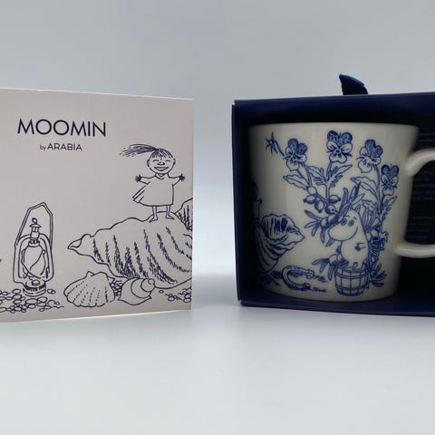 Käyttämätön ja tarrallinen Merituuli-muumimuki alkuperäispakkauksessaan.