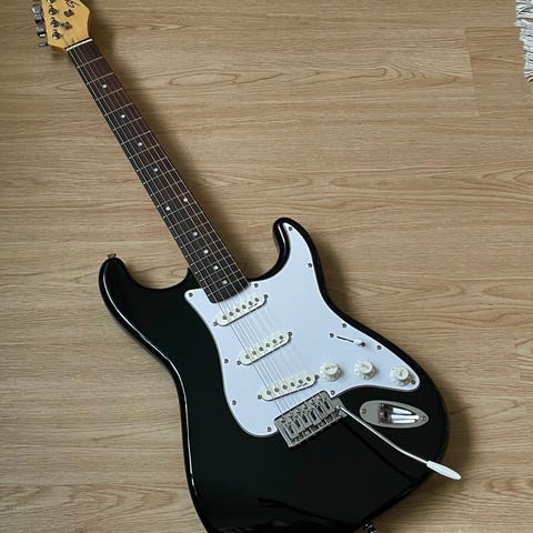 Perushyvä Squierin Stratocaster hienolla sunburst-värillä. Helpposoittoinen ja kevyissä säädöissä uusilla 09-42 kielillä. Joitakin pieniä käytön jälkiä bodyssa, nauhat ja nauhojen päät erinomaiset. Kaikki toimii täydellisesti!
