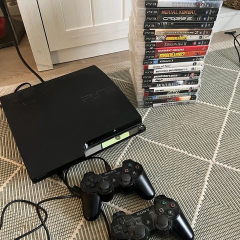 Sony PlayStation 3 pelikonsoli mustana, mukana ohjain ja neljä peliä: Assassin's Creed, Grand Theft Auto IV, Assassin's Creed II ja Uncharted. Konsoli on tarkoitettu PlayStation 3 -alustalle.Se tulee johtojen kanssa
