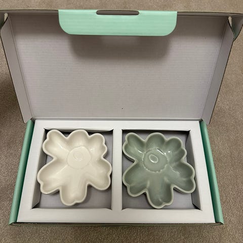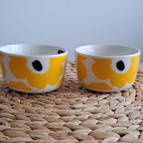 Nyydään käyttämättömät unikko kulhot. Setissä on kaksi pientä 11 cm:n kokoista Unikko-kukan mallista kulhoa. Kulhot on valmistettu valkoisesta keramiikasta. Toisessa kulhossa on kirkas lasite ja toisessa vaaleanvihreä lasite.