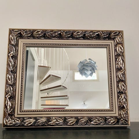 L30 X K46 cm, ketju 41 cm. Pisaranmallinen peili jämäkässä pinkiksi maalatussa metallikehyksessä.