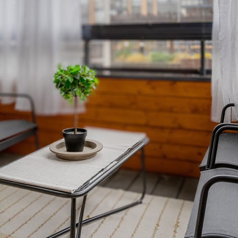 Metallinen sohva, jossa harmaat irrotettavat tyynyt. Metallinen parvekepöytä. Sopii parvekekäyttöön tai pieneen oleskelutilaan.