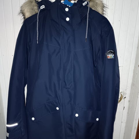 Tummanruskea pitkä talvitakki. Jäänyt ilman käyttöä, laput kiinni. Vettähylkivä pinta.