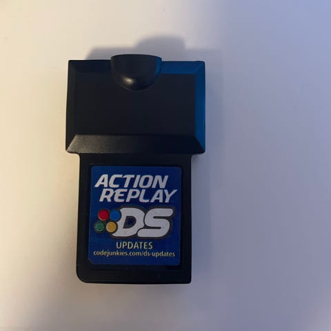 Action Replay DS pelilisälaite, joka tarjoaa päivityksiä ja lisäominaisuuksia Nintendo DS -pelikonsoleille. Laite liitetään konsolin pelikorttipaikkaan.