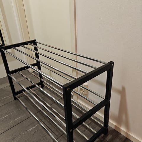 Musta kenkäteline, tukeva ja ehjä. Mahtuu monet kengät.