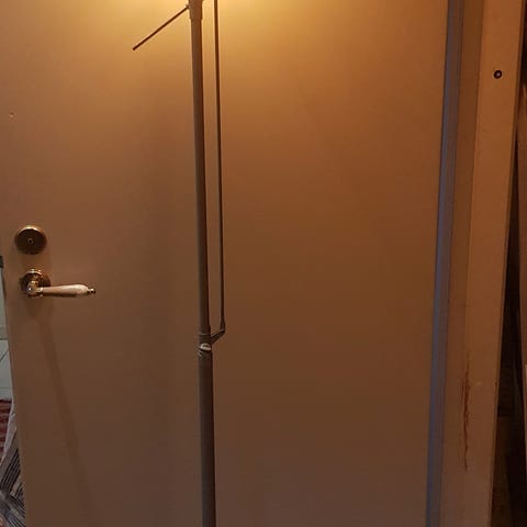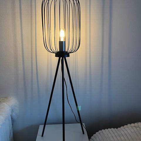 Jämäkkä ja hyvin toimiva jalkalamppu sekä 7 kpl koristelamppuja (Molnart?). Minusta tämä toimii upeasti noiden koristelamppujen kanssa. Halutessaan saa kyllä mukaan myös tavallisen lampunvarjostimen. Valaisin, lamput ja varjostin h. yht 38 eur.