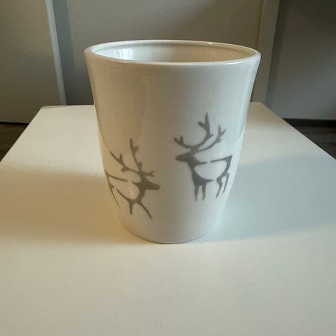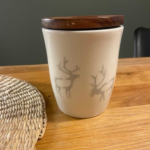 Käyttämättömäksi jäänyt Pentikin porokuvioinen purkki, jossa puinen kansi. Hyvä säilytysastia.