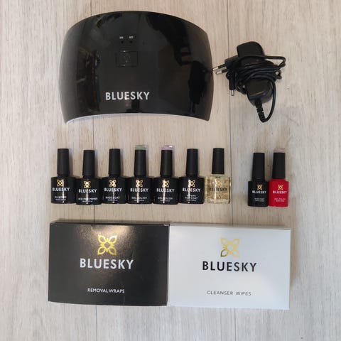 Led-lamppu, poistoöljy sekä 5 kpl geelilakkoja. Kynnen putsausaine, aluslakka tai päällyslakka ei kuulu. Geelilakkoja kokeiltu pari kertaa, öljy on avaamaton.