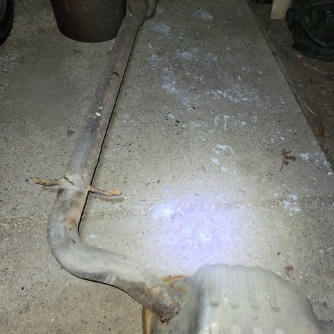 Kuvien mukainen pakoputkiston osa puretusta 2005 D5 V70 Volvosta. Takaäänenvaimentimen päällä ruostunut tuollainen "toinen kerros" peltiä mutta sen alla näkyy kirkas pelti.