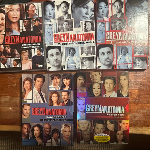 Greyn Anatomia -sarjan kaudet 1-4 DVD bokseina. Ehjät ja toimivat, kertaalleen katsottu läpi.