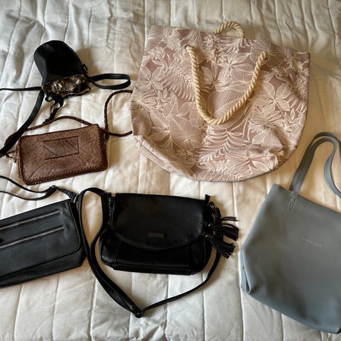 Kerran käytetyt laukku ja kukkaro. Isompi kuin peruskäsilaukku, mutta ei ihan olkalaukkukokoa.