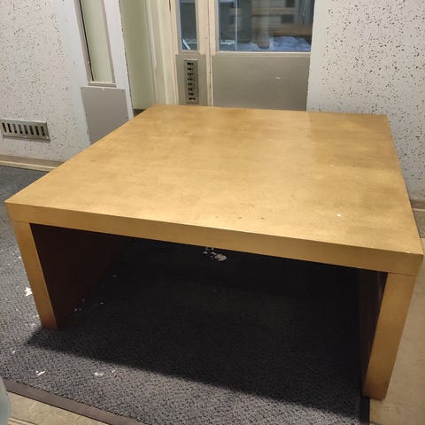 Itsetehty puinen sohvapöytä. Mitat kuvassa. Kannessa hieman jälkiä ja yhessä kulmassa kolhu, nähä näkyy kuvissa.