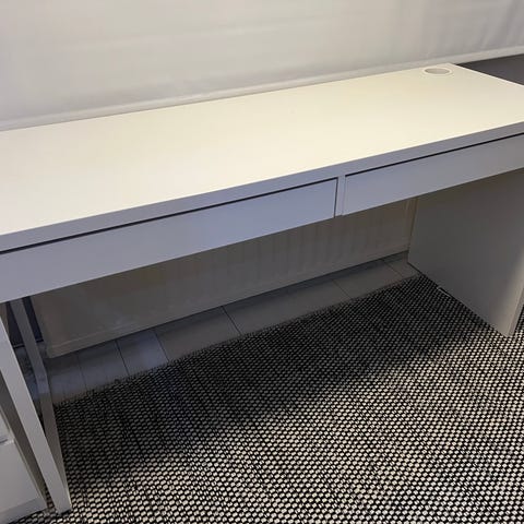 Siisti ja kevyt työpöytä. Pöydän pinnassa ja laatikossa joitain vaaleita jälkiä ja vähän kulumaa, näistä kuvat.
