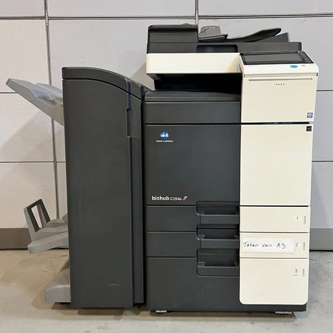 Konica Minolta bizhub C203 tulostin. Monitoimitulostin, joka soveltuu toimistokäyttöön. Värilaite, jossa useita paperilokeroita ja ohjauspaneeli.
