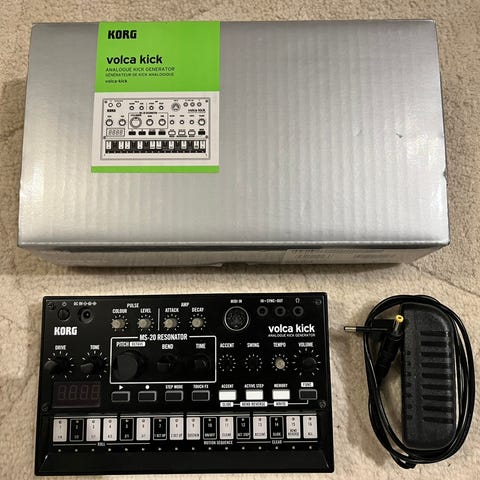 Korg Volca Bass syntetisaattori, jossa on kompakti koko. Laitteessa on useita säätimiä äänen muokkaamiseen ja sekvensseri. Sopii musiikin tuotantoon ja live-esityksiin.