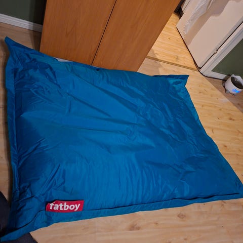 Turkoosi Fatboy säkkituoli. Hyvässä kunnossa, käytetty sisätiloissa lasten huoneessa. Tahrat, jotka eivät lähteneet pyyhkimällä näkyvät kuvissa tarkemmin. Kissatalous.