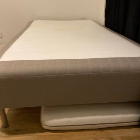 IKEA sänky runkopatjalla harmaalla verhoilulla. Mukana patja, joka on vaaleanvärinen ja pehmeä. Siisti.