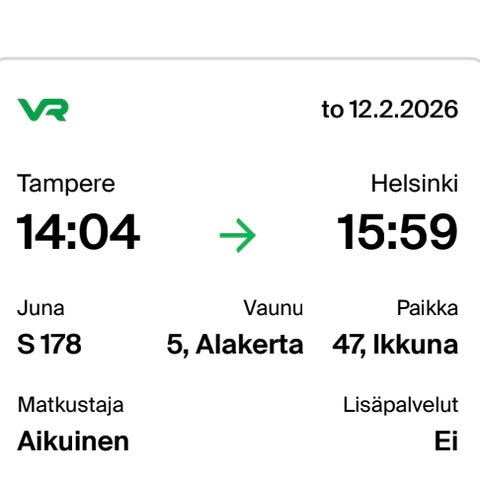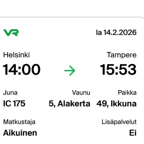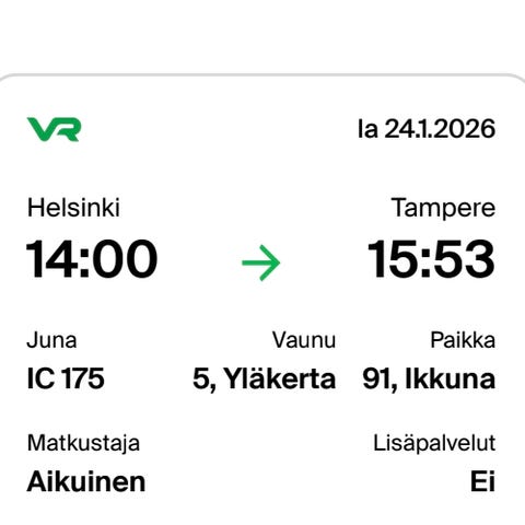 Aikuisten junalippu IC47 Helsinki - Tampere
