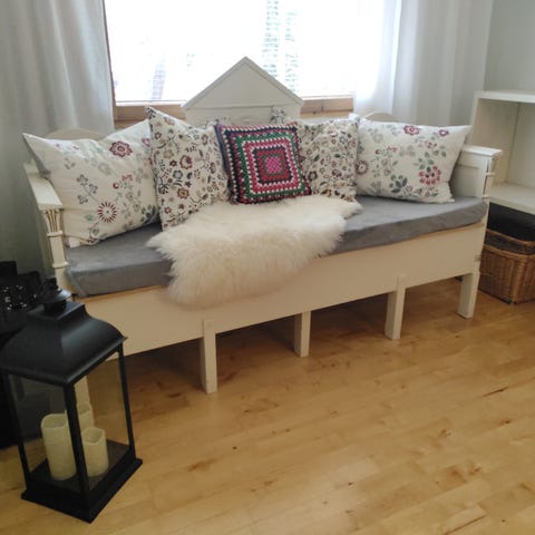 Puinen vuodesohva tummanvihreilä pehmusteilla