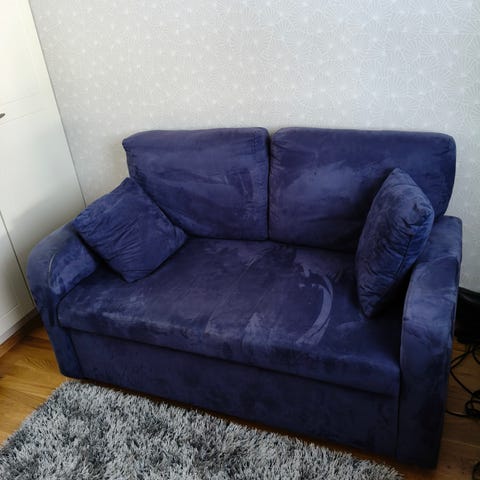 Puinen vuodesohva, jossa tummanvihreä taittopatja. Sohva muuntuu sängyksi, runko on valmistettu puusta. Verhoilu on kangasta, väri tummanvihreä. Taittopatjan verhoilu on puhdas ja ehyt. Sälepohjaa korjattu.