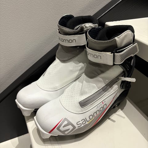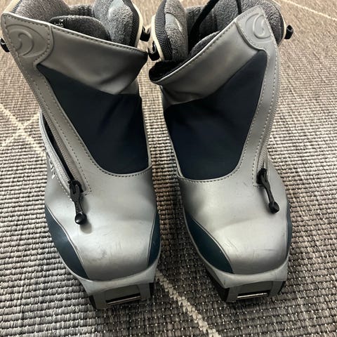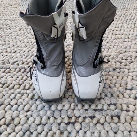 Salomonista luistelumonot SNS-lukituksella. Pohjat kuluneet kuten kuvastakin näkee mutta toimivat vielä hiihdossa.