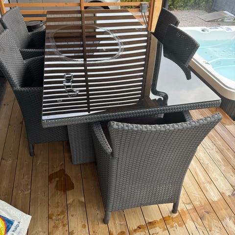 Pihakalusteet lasipöydällä ja metallituoleilla