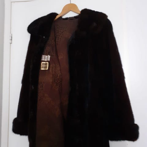Tummanruskea sievä turkki. Aito minkkiturkki 80-luvulta. Hyvin vähän käytetty, ei mitään käytön jälkiä.