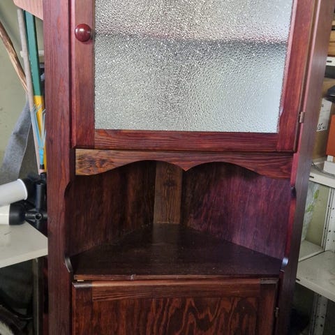 Kulmakaappi, jossa on ylä- ja alakaapit. ja hyvää säilytystilaa erilaisille esineille. Tekijä puuseppä Veikko Mäkelä, Vilppula