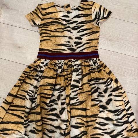 mekko, koko 134/ 140. Mekko on valmistettu puuvillasta ja siinä on kirjava kuosi. Postikulut lisätään