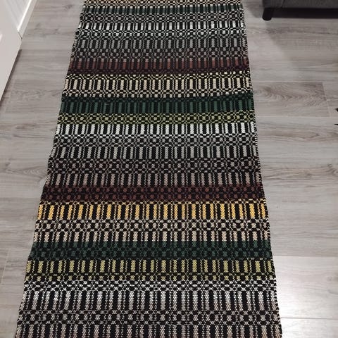 Kirkonkaari sidoksella kudottu matto mustalla kalalankaloimella. Kuteina trikoota ja lakanaa.
