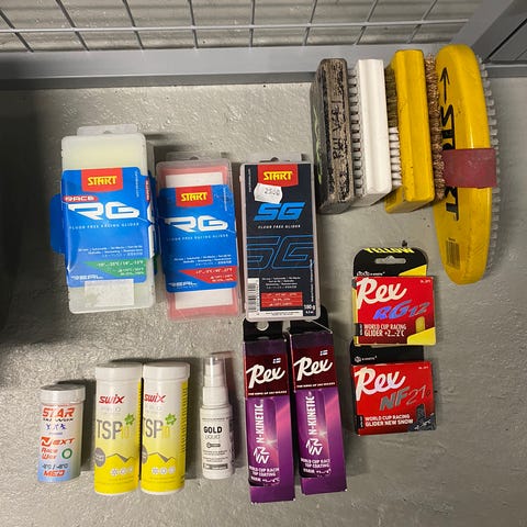 Myydään monipuolinen erä suksien hoitotuotteita: