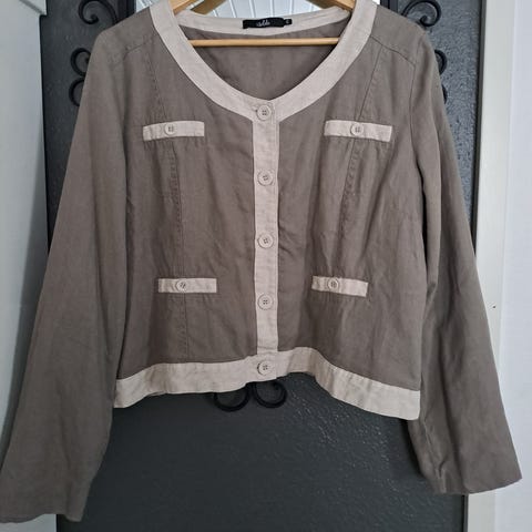 Kaunis sammalenvihreä pellavajakku. Väri toistuu parhaiten kuvissa, joissa jakku näkyy kokonaan.