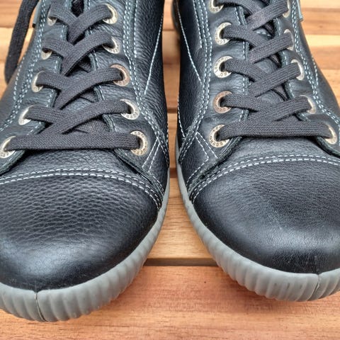 Nahkaa, siniharmaat. Kenkien päällä vaaleat kohdat, viim.kuva.