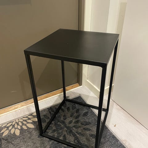 Musta sivupöytä, jonka kansi on muotoiltu kukkamaisesti. Sopii esimerkiksi olohuoneeseen tai makuuhuoneeseen lisäpöydäksi tai koriste-esineiden alustaksi. Omavalmiste.