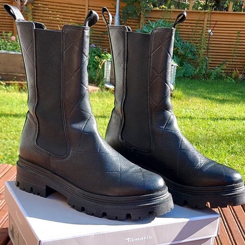 Uudet Tamaris platform-saappaat mustaa nahkaa. Koko reilu 41. 26 cm jalkaan isohkot. Kerran kokeiltu ulkona. Kapea malli, kevyt vuori, joten menee viileämmälläkin kelillä. Vetoketju sivussa, hyvät nauhat. Tosi kivat saappaat, minulle harmikseni liian isot. Myydään alkuperäisessä laatikossa. Ovh. 129€