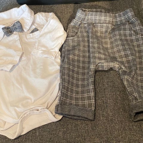 Myydään hyväkuntoinen juhla-asu 56cm. Settiin kuuluu vaaleansininen kauluspaita jossa pukemista helpottava bodyosa, sekä mustat "suorat housut".