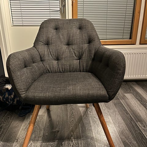 Tuoli, jossa vihreä kangaspäällyste ja puujalat. Istuin ja selkänoja ovat pehmustetut. Tuolin rakenne sisältää jousitusta istuinosassa. Sopii olohuoneen tai muun oleskelutilan kalusteeksi.