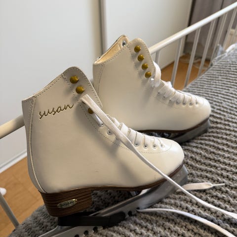 Kenkäosat erittäin siistit, terät kaipaa huoltoa. Hieno farkkukuvioinen kuosi. Koko 38