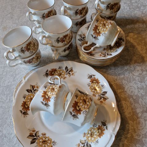 6 kpl kahvikuppeja tasseineen, pullalautanen, sokerikko ja kermakko. Queen Anne -merkkiset.