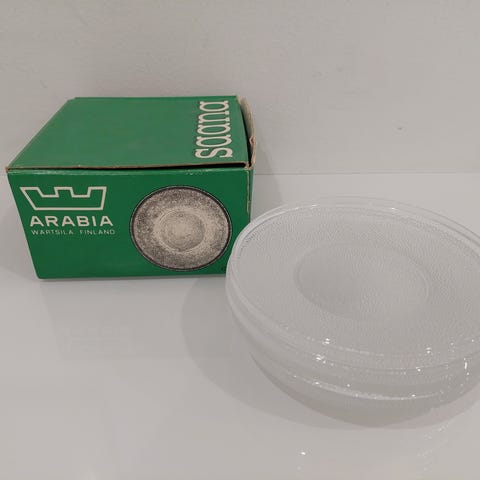 Myydään kaksi 6kpl alkuperäispakkausta (yht. 12kpl) Arabian Saana lasilautasia. Kunto hyvä ja ei lohkeamia tai halkeamia.