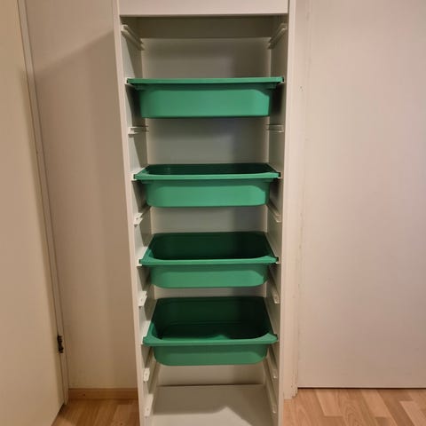 IKEA säilytyshylly lastenhuoneeseen, väri valkoinen. Hyllyssä on useita lokeroita ja osassa lokeroista on harmaat säilytyslaatikot. Hylly sopii lastenhuoneeseen säilytysratkaisuksi. Hyllyssä on käytön jälkiä ja pieniä kolhuja.