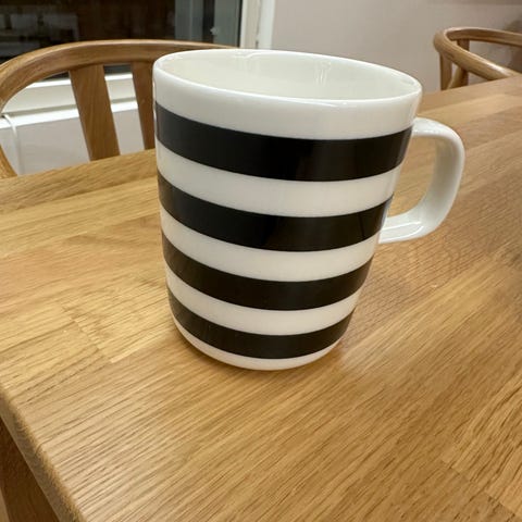 Marimekko kahvikuppi ja lautaset, valkoinen pohjaväri ja pystysuorat kultaiset raidat. Sarja sisältää kahvikupin ja suorakaiteen muotoisen lautasen. Materiaali keramiikka.